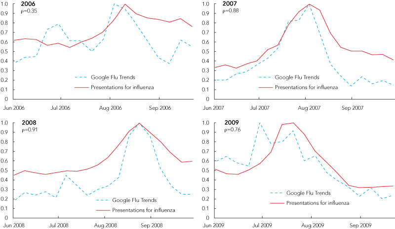 The coherence of Google Trends data with influenza presentation data is shown in Box 4. The correlation coefficients between Google search data for Queensland and statewide ED influenza presentations (ρ values) indicate an increase in correlation since 2006 when weekly influenza search data became available. While we might expect the peak in influenza ED presentations to lag behind the peak in internet searches related to influenza, the lag was more pronounced in 2009. This may indicate high public and media interest associated with an epidemic.