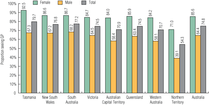 In 2008, the estimated total population of 16–29-year-olds in Australia was 4 195 961. During the study period, 3 139 354 unique GP consultations for 16–29-year-olds were reimbursed by Medicare nationally, meaning that 74.8% of this age group (85.6% of females and 64.4% of males) had at least one GP consultation in the 12-month period. The proportion of the population who had at least one GP consultation was lowest in the NT (54.3%) and highest in Tasmania (79.7%) (Box 1).
