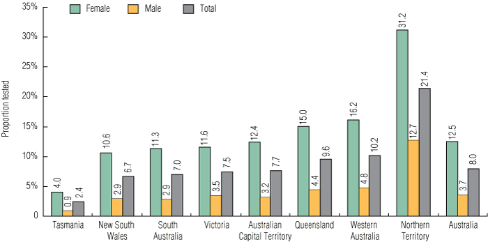Of all jurisdictions, the NT had the highest testing rate of 16–29-year-olds in the sexually active population and the lowest proportion of this age group who had visited a GP in the 12-month period. The reasons for this are not clear. It is possible that not all GP consultations were reflected in the data or that health care-seeking behaviour was systematically different. Higher testing rates may reflect the targeted screening programs for sexually transmitted infections conducted by government and Aboriginal medical services in the NT20 or a higher-risk population presenting to GPs. It is also unclear why Tasmania had the lowest testing rates, and this warrants further investigation.