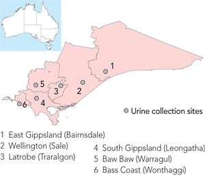 Our cross-sectional study started on 13 January 2009 and finished on 17 February 2010. It included pregnant women from the major antenatal clinics across all six Gippsland local government areas (Box 1). Participants were asked to provide a morning urine sample and fill out a self-reported dietary questionnaire. However, to ensure that urine samples were obtained from as many pregnant women as possible, 30% of samples were collected on the spot on the day women agreed to participate. The sample size calculation for this study (n = 86) followed previously described methods.10 The formula used for the sample size calculation was:
