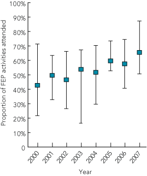 This hiatus of learning incentives may be affecting junior doctors’ engagement in the learning opportunities provided. In 2007, an FEP evaluation conducted by the MEU of Townsville Hospital (a large regional hospital in Queensland) showed that FEP attendance was poor, even with an arbitrary setting of 80% minimum attendance. The mean attendance rate for the 32 interns was 66% (range, 51%–87%), and evaluation of attendance during previous years showed 2007 was not an atypical year (unpublished data) (Box 1). Feedback provided by interns in their 2007 end-of-term evaluations indicated that the biggest barrier to their attendance at the FEP activities was a heavy workload and a corresponding commitment to maintaining patient care. This made attendance difficult, despite these sessions occurring during “protected time” (unpublished data). This is consistent with previous research findings which have shown that junior doctors find it difficult to choose between patient care, work demands and their own professional development (PD).1