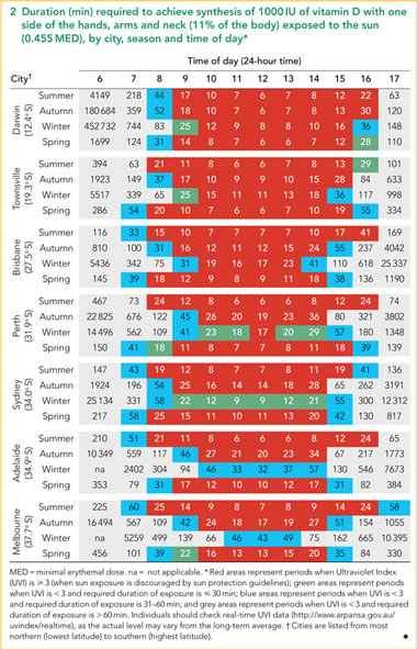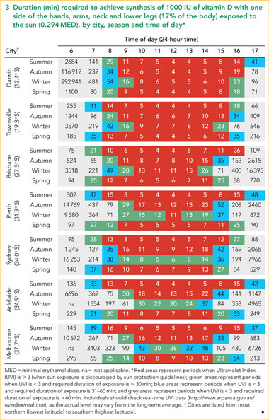 Overall, when 11% of the body is exposed to the sun, there are few opportunities to synthesise 1000 IU of vitamin D within 30 min at times of the day when sun exposure without protection is not discouraged. In nearly all cities during summer and autumn, there are no opportunities to achieve this, whereas there are more opportunities during winter and spring, particularly in southern cities such as Sydney and Melbourne. For exposure durations of 31–60 min, most cities have at least one opportunity each day to synthesise 1000 IU; however, as these periods mostly occur early and late in the day, we advise caution due to the potentially damaging effects of UVA light at these times.10 It may be preferable to instead increase the amount of skin exposed to the sun to reduce the required duration.
