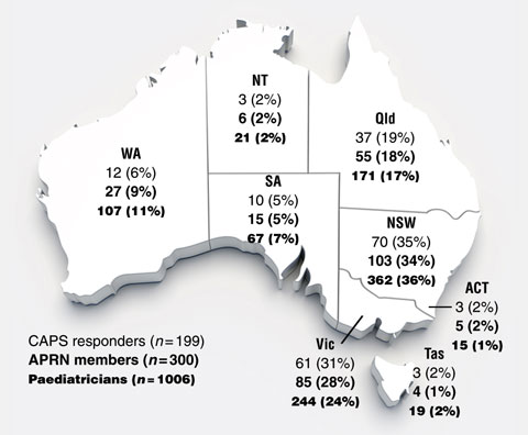 Important strengths of our study include our good response rate, use of a standardised data collection form modelled on the well tested BEACH general practice form, and our large sample size, which engenders confidence that we were able to detect any meaningful associations of family and paediatrician variables with casemix. However, the small (but proportional) numbers of responders in the NT, ACT and Tasmania mean that results may not generalise to paediatric practice in these areas. The data are unique, as no other mechanism exists in Australia for collecting detailed diagnostic data and how they relate to consultation characteristics, parent and child health, and actions arising from the consultation. Due to its national nature, CAPS reported a higher proportion of consultations with children of Indigenous descent, whose diagnoses may require different training and workforce planning, than did the Barwon study.