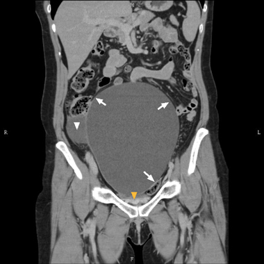 A 55-year-old woman, who had undergone a total hysterectomy decades previously, presented with lower abdominal fullness and urinary frequency. An abdominal–pelvic contrast-enhanced computed tomography scan (Box) showed a large cystic lesion measuring 20 × 17 × 15 cm, with a smaller “daughter” cyst, a compressed urinary bladder and bilateral hydronephrosis.