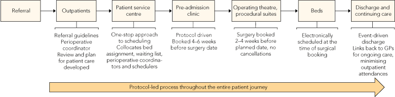 With a focus on the patient journey from initial referral to discharge, the redesigned surgical care model was streamlined, standardised, and protocol-led (Box 1). It incorporated patient screening and allocation to an appropriate ward by the perioperative coordinator; one-day attendance at a pre-admission clinic for pre-surgical evaluation and investigations; and coordination of individually tailored discharge support before admission. The redesigned processes became part of standard operating practices for all elective surgery patients and facilitated the development of admission and activity targets.