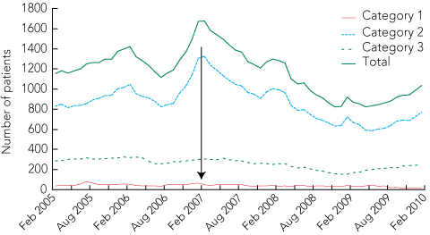3 Changes in hospital-initiated postponement (HIP) rates,* Alfred Hospital and Alfred Centre, Feb 2005 – Feb 2010