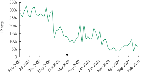The combined HIP rate for planned elective admissions in the main Alfred Hospital and the Alfred Centre decreased over the period February 2005 to February 2010 from 28% to 6% as shown in Box 3. By February 2011, HIP rates at the Alfred Centre and the main Alfred Hospital were less than 1% and 7%, respectively.