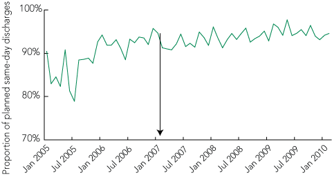 The overall proportion of patients discharged on the day of admission and procedure increased after implementing the process redesign, with a continuing overall upward trend in successful same-day discharges. There was a rise in the proportion of successful same-day discharges from 83% in February 2005 to 95% in February 2010 (Box 5).