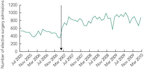 The Alfred is a major tertiary, 638-bed hospital in Melbourne, a state capital in south-eastern Australia (population, 3.9 million in 2008).4 It is Australasia’s largest designated trauma service,5 and provides elective surgery for the state of Victoria.6 By the end of 2005, with the increase in demand, prioritisation of time-critical emergency surgery was having an increasing impact on elective surgery waiting lists, with hospital-initiated postponement (HIP) rates reaching almost 30%.