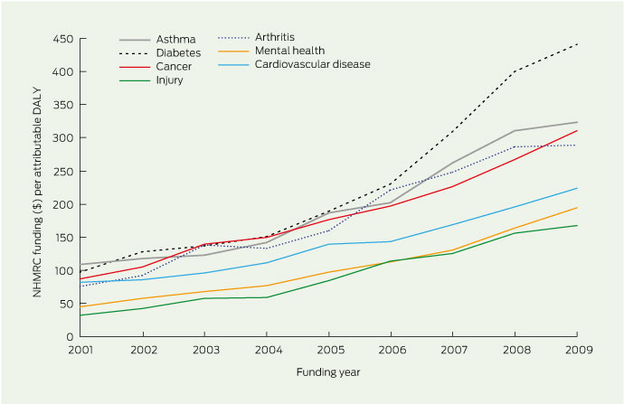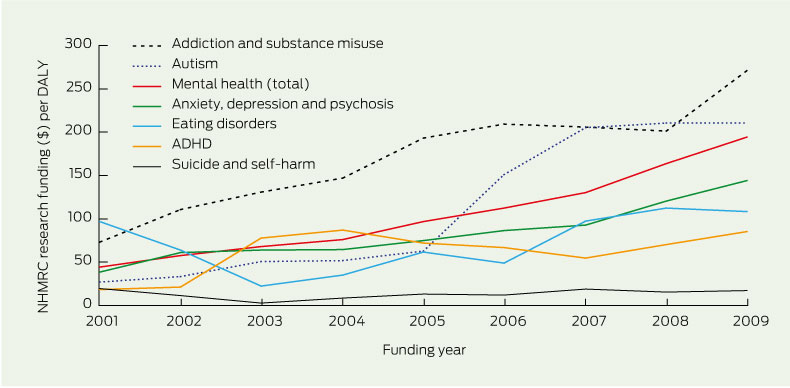 Based on our analysis, it is clear that mental health research does not receive the same level of funding support as other research areas such as cancer and diabetes, a conclusion already reached by Mitchell and colleagues.6 In the United States, 13%–15% of National Institutes of Health funding goes to mental health and drug and alcohol research, and research into ageing, a percentage that has been stable since 2001.8 Even if funding for research into ageing is excluded from the US figures, 10%–11% of US funding goes to the areas covered by the NHMRC mental health category. In short, two indicators (funds per DALY and international funding levels) indicate that mental health research funding is relatively low in Australia.