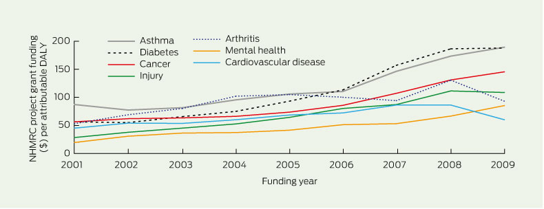 Mental health research receives lower levels of funding than cardiovascular disease and cancer research (about 9.5%, 21.7% and 14.9%, respectively, in 2009). However, when adjustments are made for burden of disease (Box 1), the areas of diabetes, asthma, cancer, arthritis and cardiovascular disease all receive proportionately more research dollars per attributable dis-ability-adjusted life-year (DALY)7 than does mental health. Relative to other conditions, diabetes had the largest increase in research funding from 2001 to 2009 (see Box 2 for data on project grants).