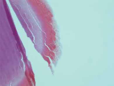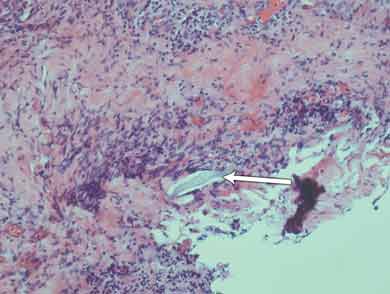 Histological results of the initial surgical specimen showed a small foreign body several microns in length intimately associated with deeply placed active inflammation (Box 1). There was fibroproliferative activity and an infiltrate of inflammatory cells; these were associated with tissue necrosis and microabscess formation. Culture of a preoperative conjunctival swab was negative for microbial growth.