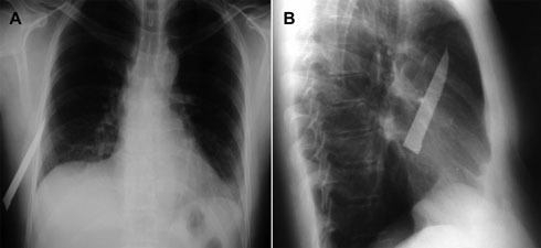A 55-year-old man suffered a thoracic knife wound during an assault. The wound was sutured by a general practitioner. Five days later, the patient re-presented to another medical centre with chest pains after travelling on two Australian domestic flights, including one for which airport security required him to undergo screening with a metal detector.