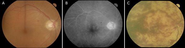 Two days later, there was a marked deterioration in the patient’s vision. Her visual acuity was recorded as “no perception of light” in both eyes. She had no headache, but she was febrile. Her right eye now had anterior chamber and vitreous cells and widespread retinal haemorrhages (Box 1, C).