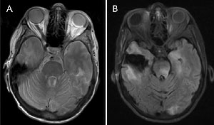 She was commenced on intravenous aciclovir. A repeat MRI scan 8 days after the initial scan showed increased signal on flair involving the thalamus, occipital, temporal lobes and brainstem in keeping with an encephalitis (Box 2, B).