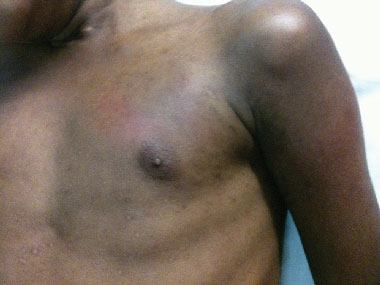 During this period, the patient developed painful, erythematous nodules over his upper torso and limbs (Box 1). His mother reported that he had experienced several such episodes in the past. The lesions measured 5–10 mm in diameter and were tender to palpation; in association with the cardiac murmur and elevated streptococcal serology there was some initial concern about the possibility of acute rheumatic fever and the patient was commenced on penicillin prophylaxis.