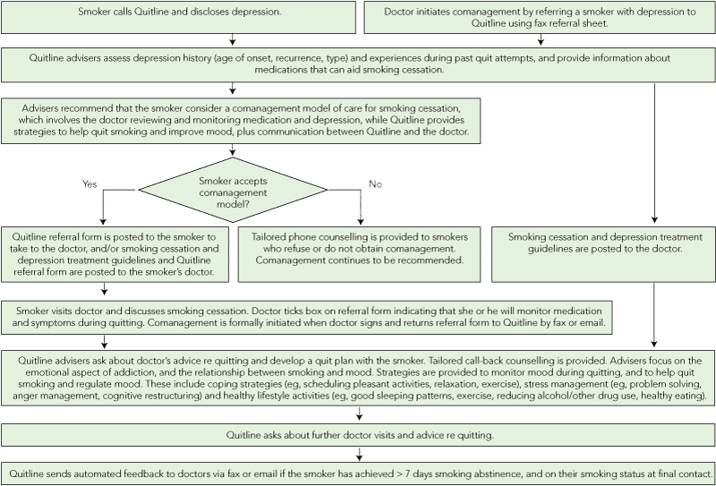 The high incidence of lifetime depression among smokers3 suggests the need to provide collaborative care between call-back services and doctors. While Quitline staff are experts in the cognitive-behavioural treatment of smoking, a number of issues require medical management, including: (i) current depression makes quitting smoking more difficult;4 (ii) smoking cessation may increase the risk of relapse of major depressive disorder which therefore requires monitoring;5 (iii) smoking cessation may require changes in medications affected by nicotine;6 and (iv) this allows for prescription of medications that dually act to aid smoking cessation and alleviate depression.4 Victoria’s Quitline is the first in Australia to have developed and instituted a tailored Quitline–doctor comanagement of smoking cessation call-back and depression. The service draws on existing evidence-based recommendations for comanagement7 and evidence that integrated cognitive-behavioural treatments may help smokers develop better management skills for both smoking cessation and depression.8