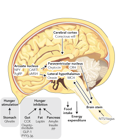 Weight is regulated by the hypothalamus (Box 1). In the arcuate nucleus there are neurons that produce neuropeptide Y and agouti-related peptide, both of which powerfully induce hunger. In the same area, other neurons produce cocaine and amphetamine-regulated transcript (CART) and pro-opiomelanocortin (which is cleaved to form melanocyte-stimulating hormone [MSH]). Both CART and MSH suppress the desire to eat. Thus whether someone feels the need to eat or not depends on the balance of the activity of these “first order” neurons. They, in turn, project to other areas of the hypothalamus that also receive input from the brain stem via the nucleus of the tractus solitarius, which transmits signals received from the vagus nerve.
