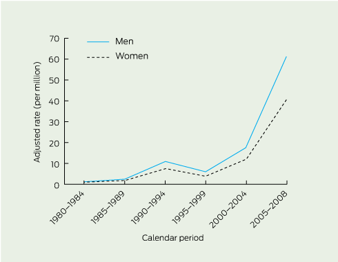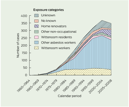 Malignant mesothelioma (MM) of the pleura or peritoneum is a universally fatal disease predominantly caused by exposure to asbestos. In Australia, the incidence of MM has increased steadily since the early 1960s, initially affecting workers mining and milling raw asbestos and manufacturing asbestos products (the first wave), and then workers who used asbestos products in industry (the second wave). Over the past 20 years, there has been increasing concern about a third wave — people diagnosed with MM after short-term and/or low-level exposure to asbestos in the home or workplace.1 Home maintenance and renovation involving asbestos-containing building products is one of the activities most frequently associated with this third wave. It is a source of ongoing concern, given the widespread distribution of asbestos-containing products in homes and other buildings in Australian cities and towns.