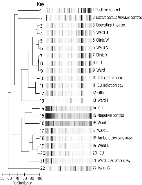 MROs were found on 25 tourniquets; however, three had been collected from MRO isolation rooms. An IMP-4 MBL-positive Enterobacter cloacae and an ESBL-positive E. cloacae were each isolated from a single tourniquet. MRSA was isolated from 14 tourniquets. VRE was isolated from 19 tourniquets: vanB-positive Enterococcus faecium from 18, and vanA-positive Enterococcus faecalis from one. Nine tourniquets isolated both MRSA and VRE, and 24 grew one or the other of these. Typing of the 18 vanB-positive isolates demonstrated five VRE clusters (Box 3). There was no apparent association between clusters of enterococci and hospital location.