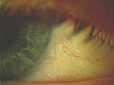 The second stage of xerophthalmia is conjunctival xerosis, or drying, in which loss of goblet cells and squamous metaplasia of the conjunctiva occur.1,3,7,8 Bitôt spots are bilateral triangular patches of keratinised epithelium at the temporal limbus and nasal limbus of the eye.1,3,7 Colonisation of these patches by saprophytic bacilli, including Corynebacterium xerosis, results in a foamy appearance.1,3,8 Conjunctival xerosis and Bitôt spots respond to vitamin A therapy in 1–5 days.1,3