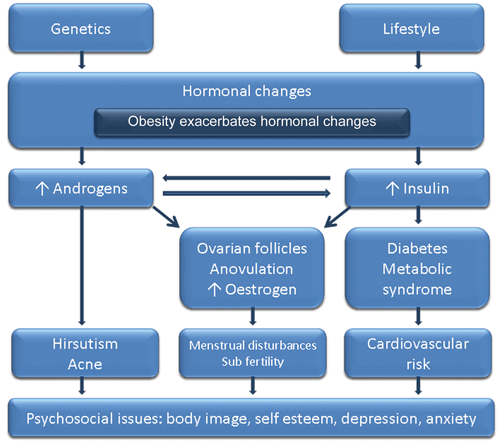 PCOS is an endocrine disorder, the pathophysiology of which remains unclear. Genetic and environmental contributors combine with obesity, ovarian dysfunction and hormonal drivers to contribute to the aetiology of PCOS.17,18 The underlying hormonal imbalance may include a combination of increased androgens and/or hyperinsulinaemia secondary to IR (Figure 1). Greater understanding of cause has been hampered by a lack of ideal methods to assess either hyperandrogenism or IR. Hyperandrogenism is detected in around 60%–80% of women with PCOS, and IR is a pathophysiological contributor in around 50%–80%.19 Obesity increases reproductive features — hyperandrogenism, hirsutism, infertility and pregnancy complications — both independently and by exacerbating PCOS.20,21 Furthermore, obesity exacerbates the PCOS-related increased risk factors for impaired glucose tolerance, DM2 and CVD,22 while obesity also affects psychological features of PCOS.