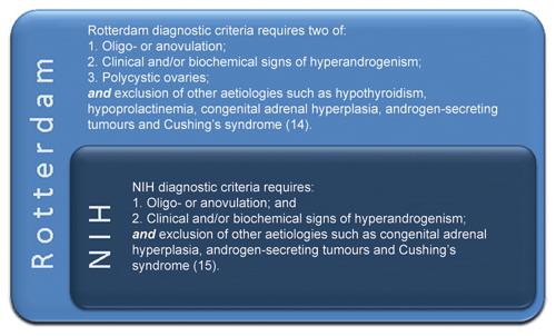 Diagnosis of PCOS is now largely based on the Rotterdam criteria,14 which are inclusive of the original National Institutes of Health (NIH) criteria15 and require two of three key features: oligo- or anovulation, clinical and/or biochemical hyperandrogenism and polycystic ovaries on ultrasound (Figure 2). However, as noted, PCOS phenotypes vary widely depending on life stage, genotype, ethnicity and environmental factors, including lifestyle and body weight.