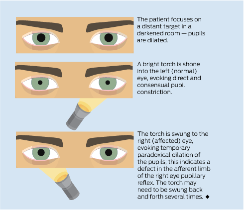Unilateral visual impairment: Visual impairment in one eye only localises the abnormality to either the eye or the optic nerve. The “swinging flashlight test” detects a difference in the visual stimulus from each eye that reaches the efferent limb of the pupillary reflex when the two eyes are stimulated alternately (Box 1). In this test, paradoxical dilation of the pupil on direct light stimulation indicates a relative afferent pupillary defect (Marcus Gunn pupil) and is pathognomonic of a process that affects the optic nerve, or less commonly the retina, in one eye. Conversely, this test is usually unaffected by conditions that interfere with the transmission of light through the eye itself, such as corneal injury, cataract and processes that make the anterior chamber or the vitreous humour cloudy.