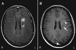 MRI scans of Mary’s brain and orbits showed altered signal intensity within the retrobulbar portion of the right optic nerve. They also showed six small areas of altered signal intensity in the supratentorial white matter affecting the periventricular and subcortical regions, one of which exhibited enhancement with the contrast agent gadolinium (Box 5). The simultaneous presence of enhancing and non-enhancing brain lesions (ie, actively inflamed and older lesions) is sufficient information to prove dissemination in time, and Mary could be told that she has MS without waiting for a second attack.