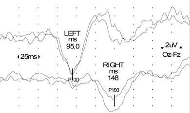 Visual evoked potentials (VEPs): In a typical clinical presentation of optic neuritis, as in this case, recording VEPs is not mandatory, but the presence of a delayed potential with preserved morphology helps confirm the diagnosis of demyelination (Box 4).