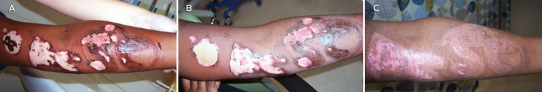 A 10-year-old Aboriginal girl with burns was referred to the Princess Margaret Hospital burns unit by a local general practitioner in far northern Western Australia. Relatively little was known about the nature of her burns or the potential toxic chemical sequelae and, because of the distances involved, it was decided to bring her to Perth. The patient had used local berries to “tattoo” both her forearms, causing bilateral caustic burns to 1% of her body surface area (Box 1, A). After consultation with the burns unit, the area was washed thoroughly with water to remove any remaining traces of caustic substance and the pH of the area was repeatedly tested. The berries had induced a partial thickness burn with blistering of the skin. The blisters were deroofed and washed and the pH checked again. The child was observed overnight for systemic and metabolic effects. The burns were initially treated with nanocrystalline silver dressing and hydrocolloid dressing, which were changed every 2 days (Box 1, B and C). These were later replaced with calcium alginate dressing and hypoallergenic polyacrylate adhesive, which were changed every 2 days until complete resolution 3 weeks later. The patient was advised to massage and moisturise the area and to use sunscreen protection.