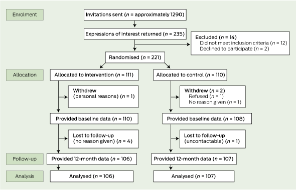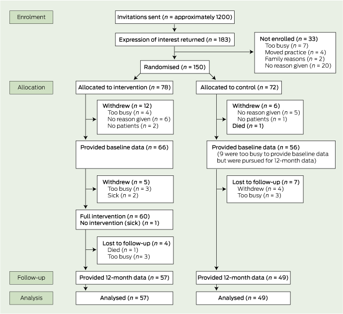 The study was powered for the proportion of patients provided with a WAAP. We estimated an event rate, at 12-months, of 40% for the control group14 and 70% for the intervention group. To provide adequate statistical power (power, 80%; P < 0.05) to demonstrate a between-groups difference of 30% in the primary outcome at 12 months, we set out to enrol 60 GPs per group, expecting that 45 per group would complete the study. With an average of four patients per GP, we estimated that this would provide a sample size of 240 patients per group and that 180 patients per group would complete the study.