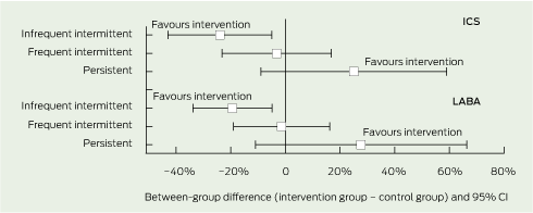 Favourable changes in family-reported use of inhaled corticosteroids and long-acting β-agonists were associated with the intervention at 12 months (Box 6). Children in the intervention group who had infrequent intermittent asthma symptoms had lower use of inhaled corticosteroids (difference, 24%; 95% CI, − 43% to − 5%; P = 0.03) and long-acting β-agonists (difference, 19%; 95% CI, − 34% to − 5%; P = 0.02). Conversely, children in the intervention group who had persistent asthma symptoms had higher use of inhaled corticosteroids (difference, 25%; 95% CI, − 9% to 59%; P = 0.4) and long-acting β-agonists (difference, 28%; 95% CI, − 11% to 66%; P = 0.4), although the confidence intervals were wide and the differences not statistically significant. In children who had frequent intermittent asthma symptoms, there was little difference between groups in the use of inhaled corticosteroids (difference, 3%; 95% CI, − 23% to 17%; P = 0.9) or long-acting β-agonists (difference, − 1%; 95% CI, − 19% to 16%; P = 1.0).
