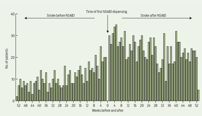 The absolute risk of stroke in our study was low: 7.1 strokes/1000 people/year, derived from those who had a stroke in the 12 months before incident NSAID use. However, analysis showed a 1.88 times (95% CI, 1.70–2.08) increased risk of hospitalisation for stroke (ischaemic or haemorrhagic) following incident dispensing of an NSAID (Box 1), with a strong temporal association observed (Box 2). This equates to an increased absolute risk of 13.4 strokes/1000 people/year. Significant positive associations between starting an NSAID and having a hospitalisation for stroke were found for all NSAIDs except ibuprofen, with ASRs ranging from 1.44 (95% CI, 1.16–1.80) for indomethacin to 1.80 (95% CI, 1.59–2.04) for rofecoxib (Box 1).