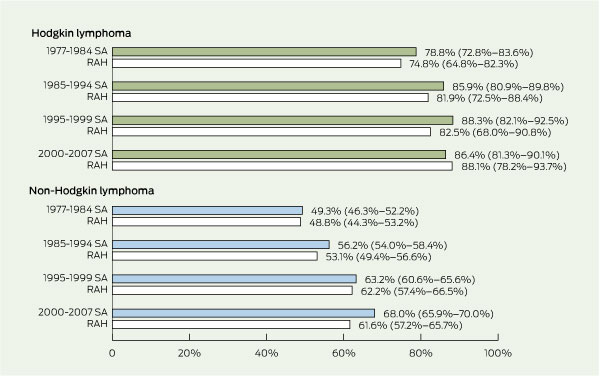The comparison of RAH data with SA population data are interesting for two reasons. First, the RAH is a state centre for allogeneic and autologous transplantation, so the cohort of patients treated at RAH has a poor prognosis. Second, during the period of the study, the proportion of patients with lymphoma diagnosed and treated at RAH decreased from 44% to 26% of all patients treated in SA. However, for patients over 75 years, this proportion increased from 17% to 25%; thus, the RAH treats both older patients and those with a poorer prognosis. Given this, it is encouraging that the 5-year survival results for patients treated at RAH for all forms of lymphoma are similar to those in SA, Australia and the US.