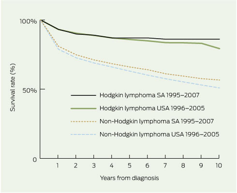 Previous analyses have shown very similar survival estimates in SA, irrespective of whether relative survival rates or disease-specific survival rates were used, such that disease-specific survival rates could be regarded as a good proxy for relative survival rates at a population level. For example, in a study of patients diagnosed from 1977 to 1996, 10-year lymphoma survival rates were identical (49%) for SA, irrespective of methodology.3