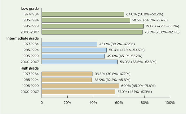 The 5-year survival rates of patients with NHL in SA increased by 18.7 percentage points from 1977–1984 to 2000–2007 (Box 1). Box 2 shows that yearly survival rates for patients with NHL in SA (1995–2007) also compare favourably with NHL survival rates in the US (1996–2005). Survival rates for patients with NHL by IWF grade and diagnosis period are given in Box 5. From 1977–1984 to 2000–2007, the 5-year survival rates for low-, intermediate- and high-grade NHL increased by 14.2, 16.0, and 17.7 percentage points, respectively. For intermediate-grade NHL, the 5-year survival rate increase was statistically significant, but for high-grade NHL only the survival rate increases between 1985–1994 and 1995–1999 were significant.