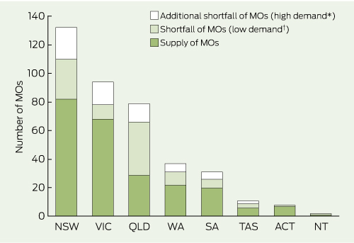 We identified a current shortage of MOs in Australia, expected to persist in the future. A conservative estimate of the current supply, demand and shortfall of MOs was 234, 326 and 92 FTE respectively (at a workload of 150 new patients/FTE MO/year). Shortfalls of MOs were found in all states and territories and in metropolitan and rural centres.