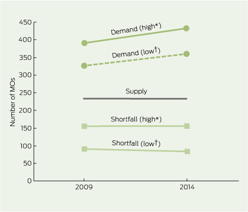 Although not directly comparable, our findings are similar to the results of the most recent study of the oncology workforce in the US,7 and studies of the medical workforce in other oncology specialties such as radiation oncology14 and palliative care.15 The US study found that demand for MOs is expected to rise by 48% between 2005 and 2020, but supply will only rise 14%, translating into a shortfall of 2550 to 4080 oncologists (about one-quarter to one-third of the 2005 supply).