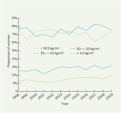 For comparison with our cohort, the 2004–05 National Health Survey reported that 5% of all Australian women aged 25–44 years were underweight, 56% had a normal BMI, 24% were overweight, and 14% were obese.18 In contrast with the continuing increase in male obesity, there was a greater increase in obesity prevalence in women between 1989 and 2001 than between 2001 and 2004–05.18