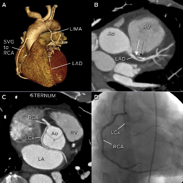 Assessment of CABG patency and vascular mapping before repeat CABG surgery.