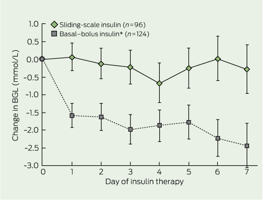 Results: Mean baseline BGL was not significantly different in patients receiving BBI and SSI (mean ± SD, 11.3 ± 4.1 v 10.6 ± 4.3 mmol/L; P = 0.23). After the first full day of therapy, mean daily BGL for patients receiving BBI was 1.6 ± 3.7 mmol/L lower than baseline BGL, and it remained 1.6–2.4 mmol/L lower than baseline throughout the study (P < 0.001). In contrast, there was no significant change in BGL for patients receiving SSI. Random effects regression analysis indicated that BBI was associated with a significantly lower mean daily BGL than SSI, independent of other variables (P < 0.001). The incidence of hypoglycaemia (BGL < 4 mmol/L) was significantly greater in patients receiving BBI than SSI (3.3% v 1.4%; P < 0.001), but there was no significant difference for severe hypoglycaemia (BGL < 2.8 mmol/L) (0.3 v 0.5%; P = 0.3).