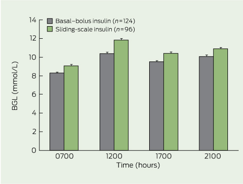 This study demonstrates that use of a hospital BBI protocol by junior medical staff to treat hyperglycaemia resulted in lower mean daily BGLs in non-critical medical and surgical inpatients for up to 7 days compared with empirical management with SSI. The improvement was seen within 24 hours of starting BBI and was evident at all BGL measurement times. Patients receiving BBI had an increased incidence of hypoglycaemia, but not severe hypoglycaemia. These findings are similar to those reported under rigorous study conditions and suggest that BBI is effective, safe, sustainable and has reproducible outcomes outside the formal study setting across a wide range of patients.16,17 Although our study did not test an optimal SSI regimen and therefore does not provide definitive proof that BBI is superior to SSI, our data extend the published data by showing that BBI appears to be superior to SSI in real-world clinical practice.
