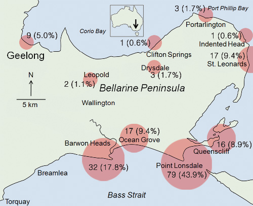 Most cases occurred in focal coastal towns, particularly Point Lonsdale (79; 44%) and Barwon Heads (32; 18%), with inland areas poorly represented (Box 2).