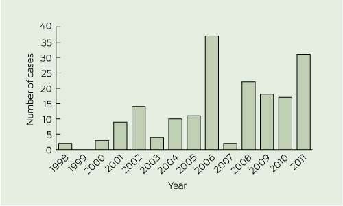 M. ulcerans infection was diagnosed year-round, with a peak incidence in winter months: 75 patients (42%) presented in winter, 41 (23%) in spring, 39 (22%) in autumn, and 25 (14%) in summer. Although the annual case number varied, case numbers increased overall, from 42 in 1998–2004 (average, 6 per year) to 138 in 2005–2011 (average, 20 per year) (Box 3).