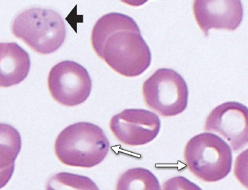 1 Blood film from a 56-year-old man infected with Babesia microti, showing a tetrad form (black arrow) and single ovoid forms (white arrows)