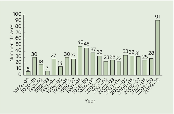 The year beginning with the wet season of 2009–2010 had the highest recorded number of cases of melioidosis in the Top End for the past 21 years. Over these 12 months, our estimated population-based annual incidence of 50.2 cases per 100 000 is the highest recorded anywhere in the melioidosis-endemic region of South-East Asia and northern Australia. The previous highest annual incidence in the Top End was 41.7 cases per 100 000 population in the calendar year of 1998, which included case clusters following Tropical Cyclone Les, which flooded the town of Katherine, and Tropical Cyclone Thelma, which passed over the north-west end of the Tiwi Islands.9 The prior highest recorded annual incidence anywhere else was 42.7 per 100 000 in the Torres Strait Islands during 1995–2000.11