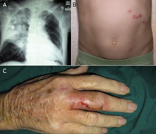 Box 5 shows some clinical examples of melioidosis. No patient without a recognised risk factor for melioidosis died from the disease during 2009–2010; 10 of the 11 patients who died had either diabetes or hazardous alcohol intake or both. Of the seven Indigenous patients who died from melioidosis in 2009–2010, five were initially from remote Indigenous communities but were living in the Darwin urban area when they acquired melioidosis (four of these were homeless); all five had hazardous alcohol intake. Eleven other Indigenous patients living in urban Darwin at diagnosis were originally from remote NT Indigenous communities. Over half had moved to Darwin within the preceding year. Nine of these 11 patients had hazardous alcohol intake as a risk factor, including three who were homeless.