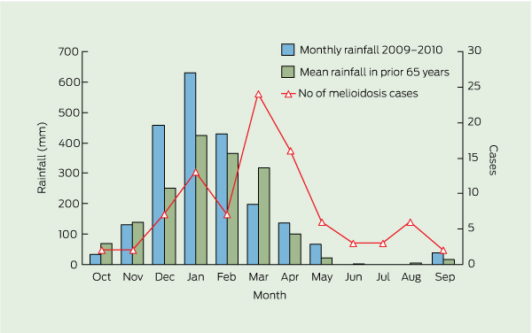 The association between melioidosis and rainfall and severe weather events is well recognised in Australia3,5,6 and South-East Asia.12,13 The 2009–2010 rainfall pattern is considered the major contributor to the increase in cases. There was consistently heavy rainfall in the Darwin area in December 2009 and January 2010, with two severe weather events leading to intense rainfall in December and February. Other Top End locations had variable rainfall patterns which were generally less intense than in Darwin.