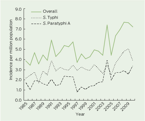 The incidence of enteric fever cases manifest in Australia was relatively stable during the late 1980s and 1990s at three per million person-years for S. Typhi and two per million person-years for S. Paratyphi. However, there has been an upsurge since 2003 in S. Typhi to around four to five per million person-years and in S. Paratyphi to around three per million person-years (Box 3).
